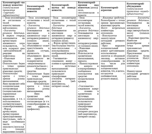 Прежде чем перейти к описанию выводов отметим, что предложенная в Таблице 1 группировка достаточно условна и нацелена скорее на то, чтобы указать наиболее характерные черты выделенных групп комментариев.