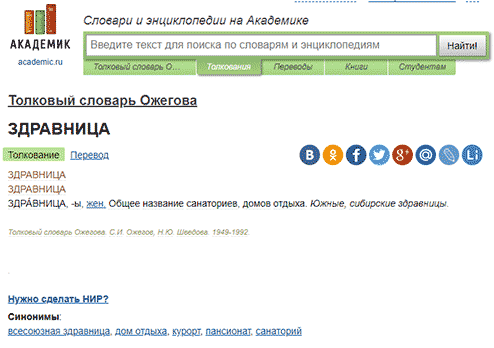 В данной справке выбираем слово с НКК, например, здравница. Находим его в толковом словаре, опять через программу кодируем ссылку и получаем еще один код, который отправляет нас к значению данного слова. Под этим кодом мы видим следующее (рис.2).