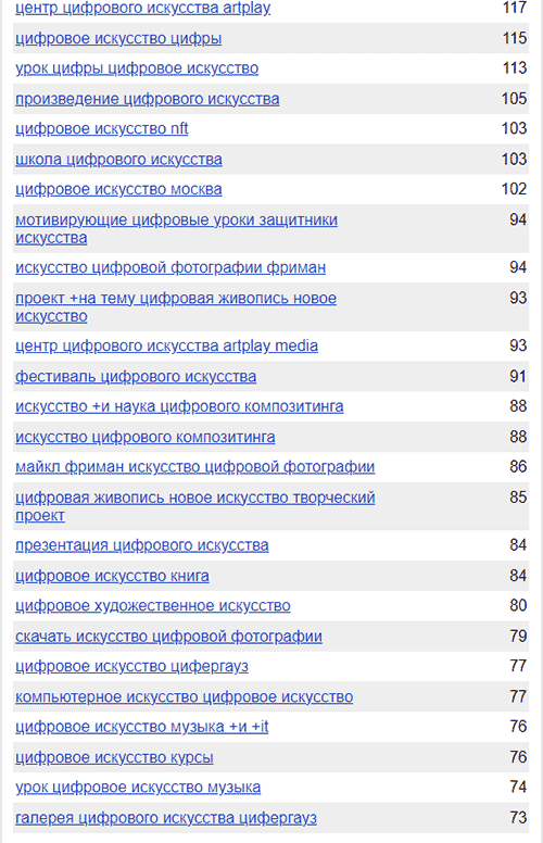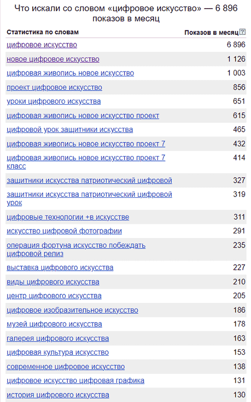 Рис. 2. Результаты анализа запроса «цифровое искусство» по данным Wordstat Yandex